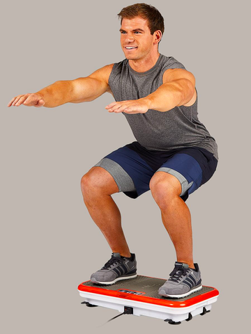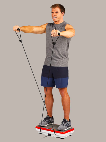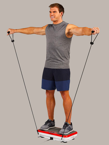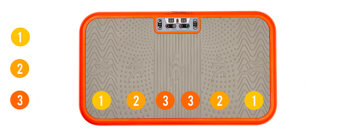 Lleva tus pies hacia afuera para simular un trote. Cuanto más alejados esten los pies del centro, más intenso será el trote. También es ideal para flexiones u otros ejercicios que pueden ser el doble de efectivos si se hacen con vibración.